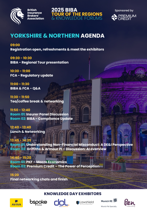 Don’t miss the chance to hear what we may not put in writing, at our regional tour in Yorkshire & Northern. There’s no doubt this year it set to be eventful so please join your fellow insurance professionals at our Yorkshire & Northern Regional Tour and Knowledge Forum event. It’s your chance to meet and question the BIBA team, find out what we’ve been doing on your behalf and hear from some special guests. The BIBA Manifesto is at the centre of what we do for members and the Tour events provides an important opportunity for you to gain insight on progress against this year's Manifesto issues, as well as influence its content for the following year. We will look at the impact of our broker advertising campaign, regulation, including on premium finance and the Government's wider deregulation agenda, just to name a few. It’s an event not to be missed. We are pleased to announce that Premium Credit Limited, one of our most popular and long-standing facility providers, is once again sponsoring the tour. This event gives you a unique opportunity to engage with our CEO Graeme Trudgill, Regulation Director David Sparkes, and your Regional Manager, Neil Jenkinson. Best of all, attendance is completely free! - Book your place now. We are also delighted to welcome back the FCA’s insurance team, who will provide first-hand insights into their ongoing work while giving you the chance to share your feedback directly. This is an invaluable opportunity for you, as a BIBA member, to engage with the regulator’s senior insurance team on key issues affecting you. We have an exciting line-up of engaging and knowledgeable guests this year, providing even more perceptions, and there will be ample time to network, exchange ideas, and gain valuable understanding of current issues. Don't miss this opportunity to stay informed, connect with peers, and shape the future of insurance broking. We look forward to seeing you there! This event is FREE of charge for BIBA members, will qualify for CII CPD points and lunch is provided. CLICK HERE to view the full-day agenda, speakers information, and sessions learning objectives.